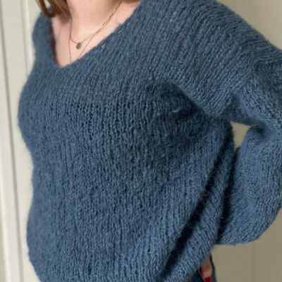 Sofiegenser strikkes ovenfra og ned i glattstrikk og er en luftig og oversized genser med v-hals og vide ermer. Oppskriften har ikke forkortelser og passer for nybegynnere.
