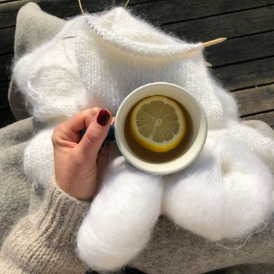 - en kopp te, en genser som vokser mellom hendene, skuldrene som senker seg.